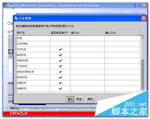 点击【口令管理】,打开口令管理对话框,如图,设置sys,和system用户密码, 可以设置为一样