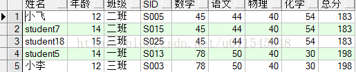 把行转成列 把学生表,成绩表,班级表,学科表 合并成一张成绩表效果如下: