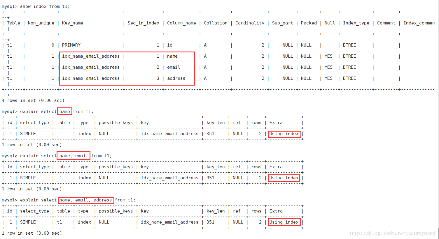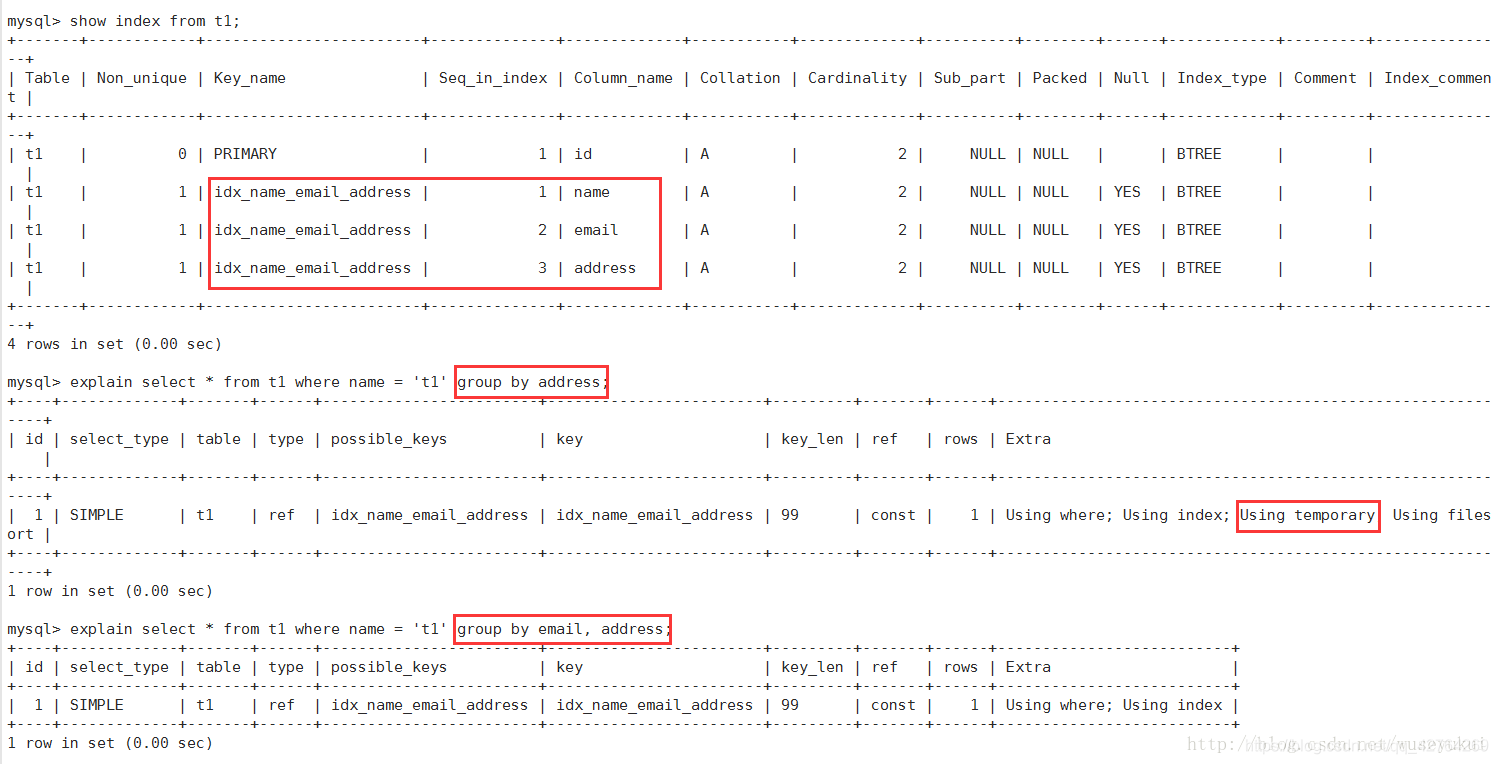 由于索引是先按email排序、再按address排序,所以查询时如果直接按address排序,索引就不能满足要求了,mysql内部必须再实现一次“文件排序”