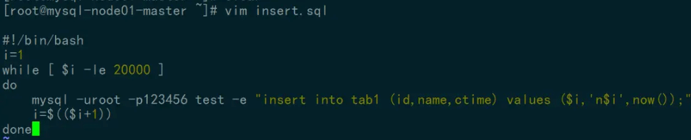 mysql -uroot -p123456 test -e “insert into tab1 (id,name,ctime) values ($i,’n$i’,now());”