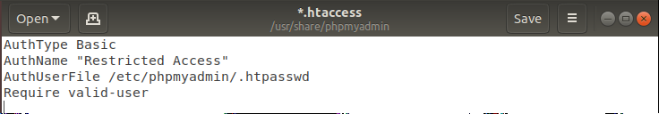 $ sudo gedit /usr/share/phpmyadmin/.htaccess