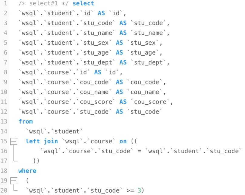 分析:从explain分析看出,student作为驱动表,把student.stu_code >= 3作为过滤条件进行全表扫描,然后把查询到的每条纪录的student.stu_code(也就是on条件里面的)分别作为过滤条件让被驱动表course做单表查询。