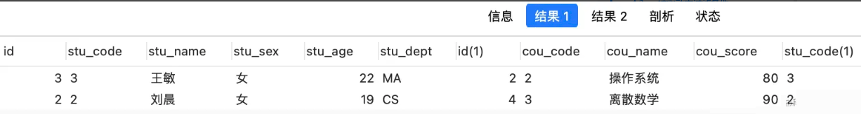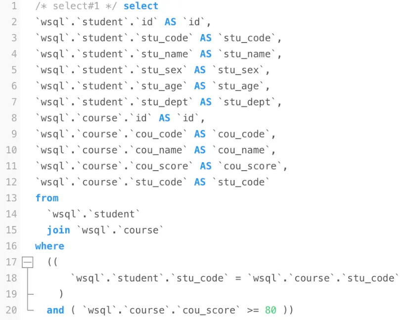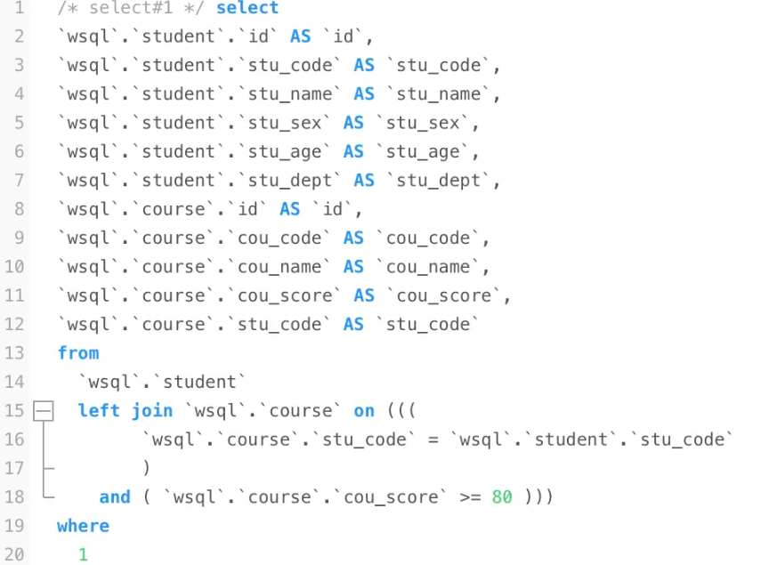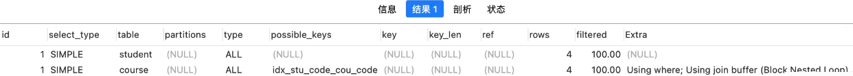 分析:从explain分析看出,student作为驱动表,做全表扫描,然后把查询到的每条记录的student.stu_code和course.cou_score >= 80(也就是on条件里面的)分别做为过滤条件让被驱动表做单表查询;