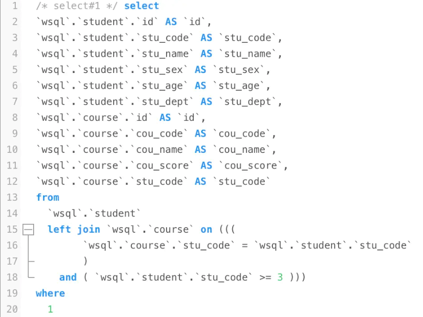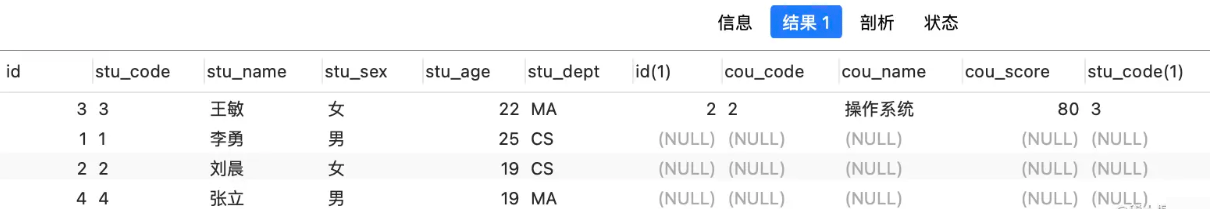 分析:从explain分析看出,student作为驱动表,做全表扫描,然后把查询到的每条记录的student.stu_code和student.stu_code >= 3(也就是on条件里面的)分别做为过滤条件让被驱动表做单表查询;此时student.stu_code >= 3对驱动表是不过滤的,仅在连接被驱动表时生效,查询不到符合纪录而返回NULL!