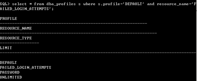 SQL> select * from dba_profiles s where s.profile=’DEFAULT’ and resource_name=’FAILED_LOGIN_ATTEMPTS’;