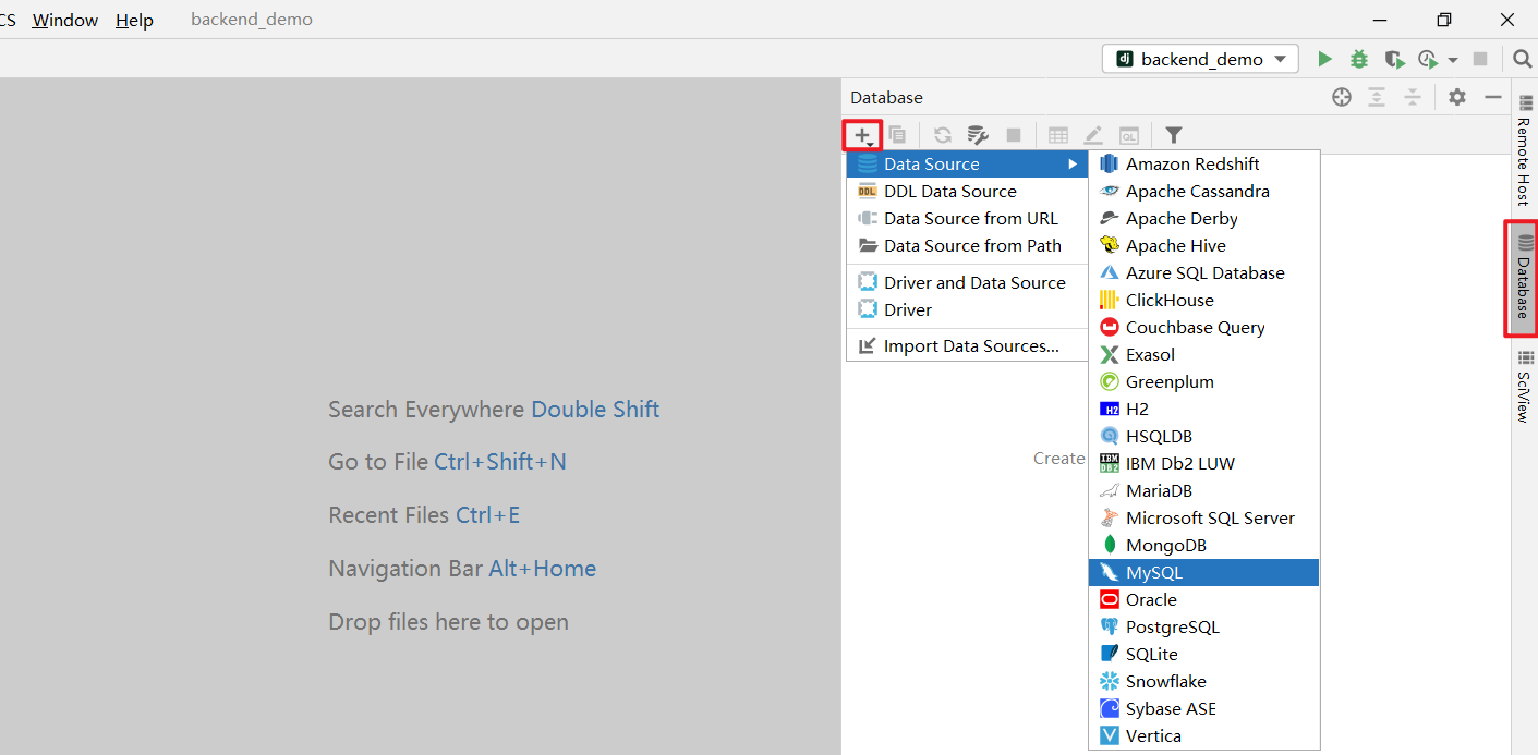点击加号,选择 MySQL 作为 Data Source。