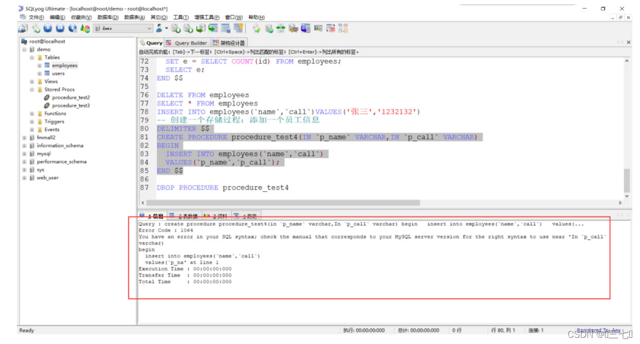 细节注意:下面的存储过程创建会报错,他的类型以及类型长度需要和创建表字段的类型和类型长度一致