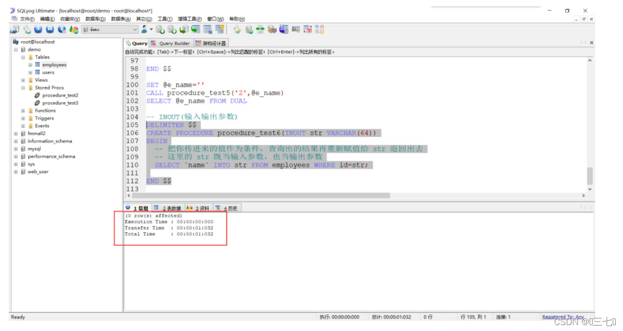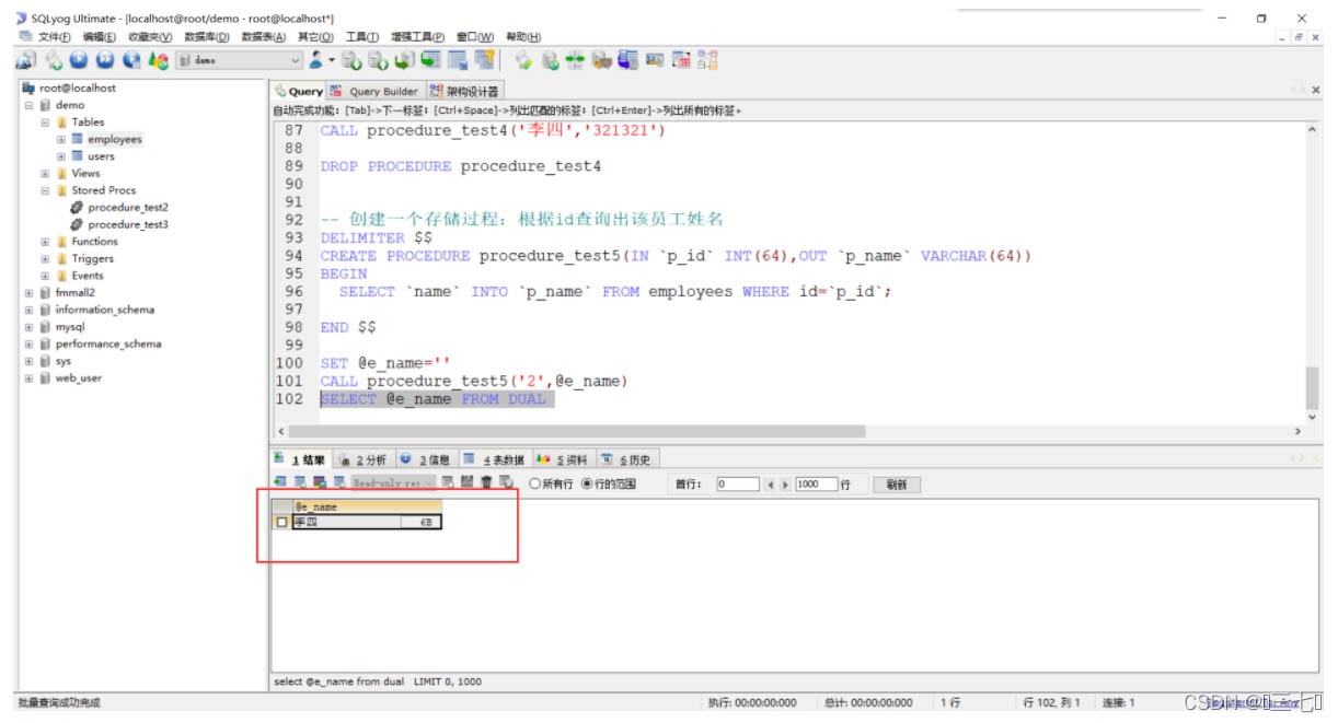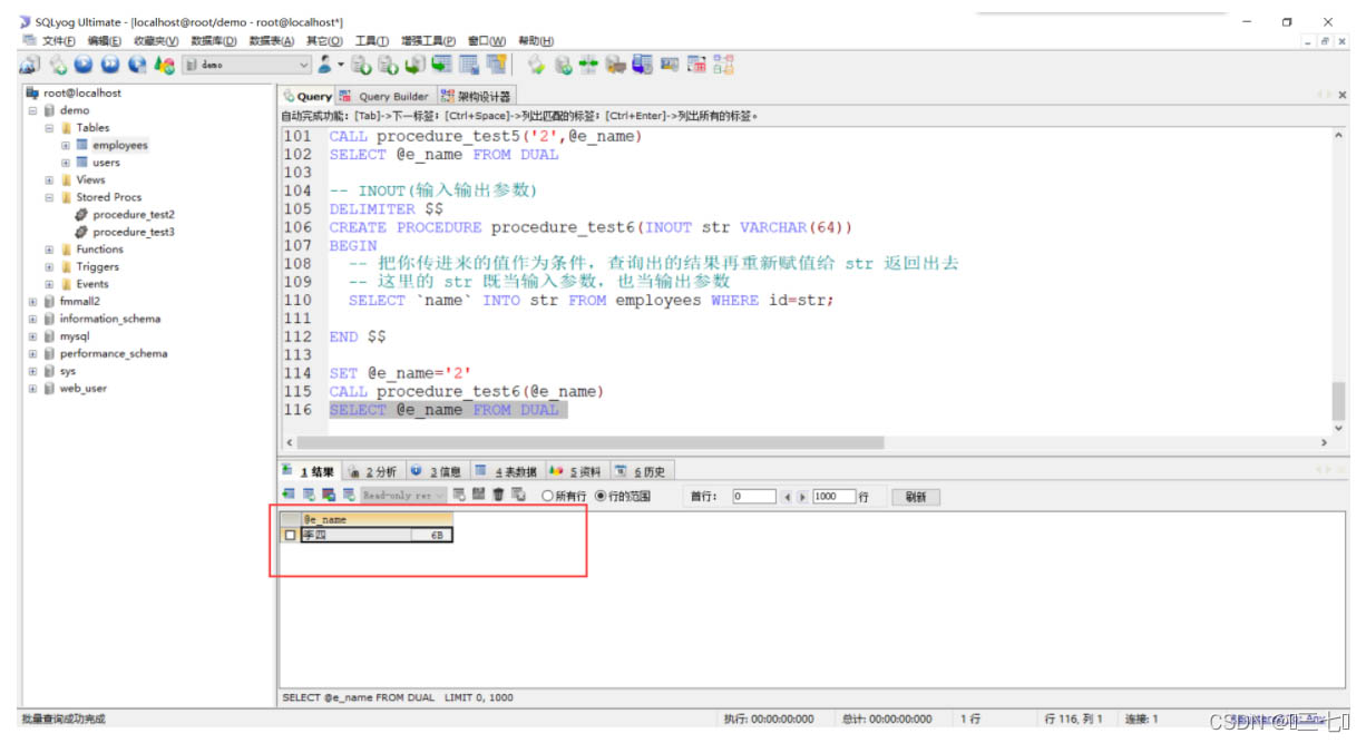 - 输出参数(OUT):将存储过程中产生的数据返回给调用者,相当于Java方法的返回值,但不同的是一个存储过程可以有多个输出参数