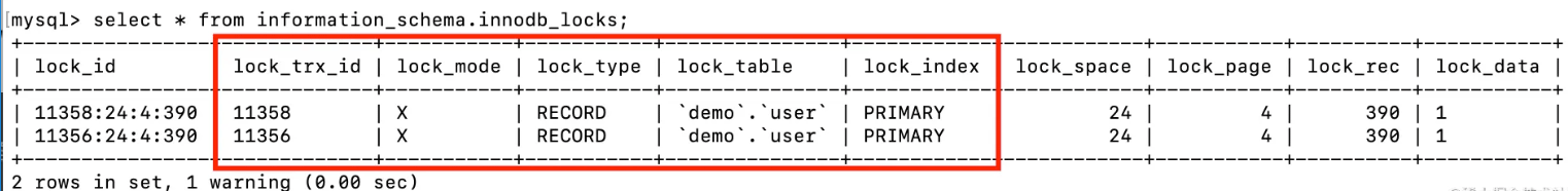 不用问,第二条,显示正在运行状态(RUNNING)的事务就是正在持有锁的事务1,MySQL线程id(trx_mysql_thread_id)是193。