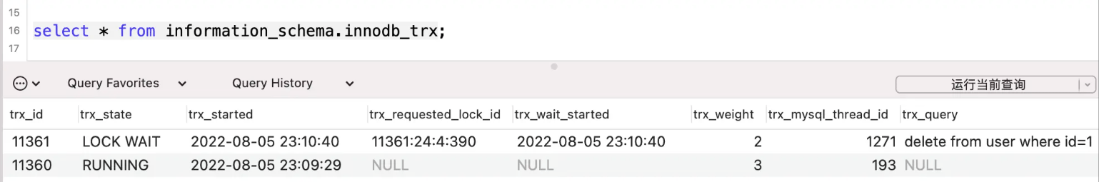 可以清楚的看到正在执行的事务有两个,一个状态是锁等待(LOCK WAIT),正在执行的SQL也打印出来了: