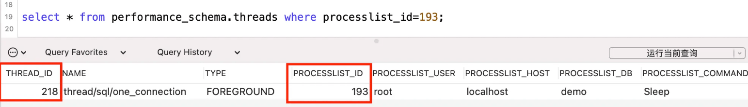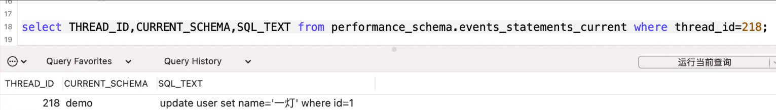 找到对应的事务线程id是218,然后再找一下这个线程正在执行的SQL语句:
