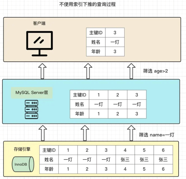 我们再看一下在使用索引下推的情况,查询过程是这样的: