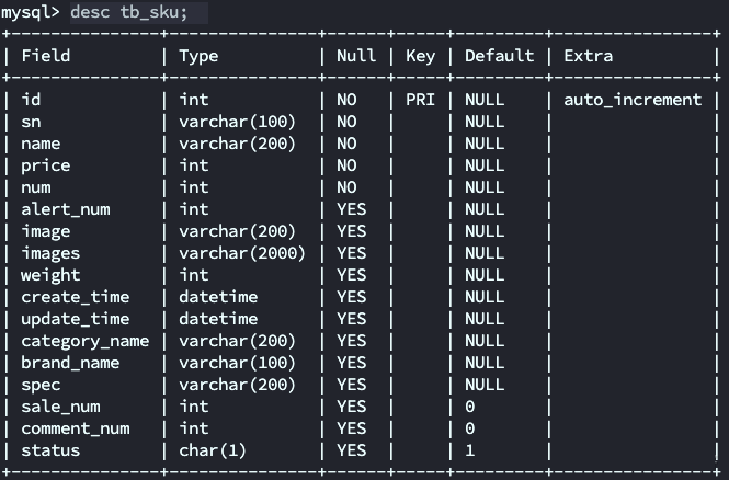 假设有表tb_sku,其表结构如下: