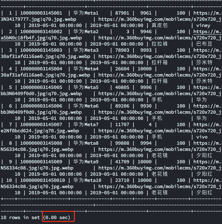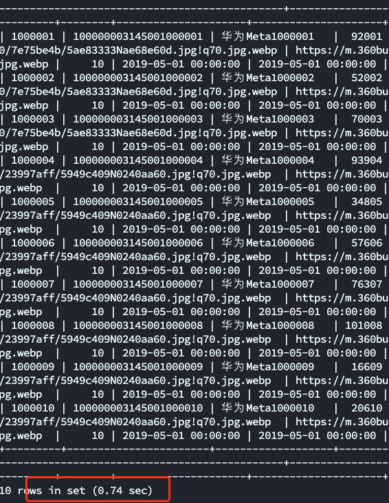语句从记录位置10的位置开始再往下返回10 条记录,也就是第二页的信息。其返回时间也是比较快。