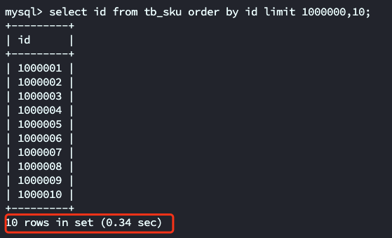 select id from tb_sku order by id limit 1000000,10;