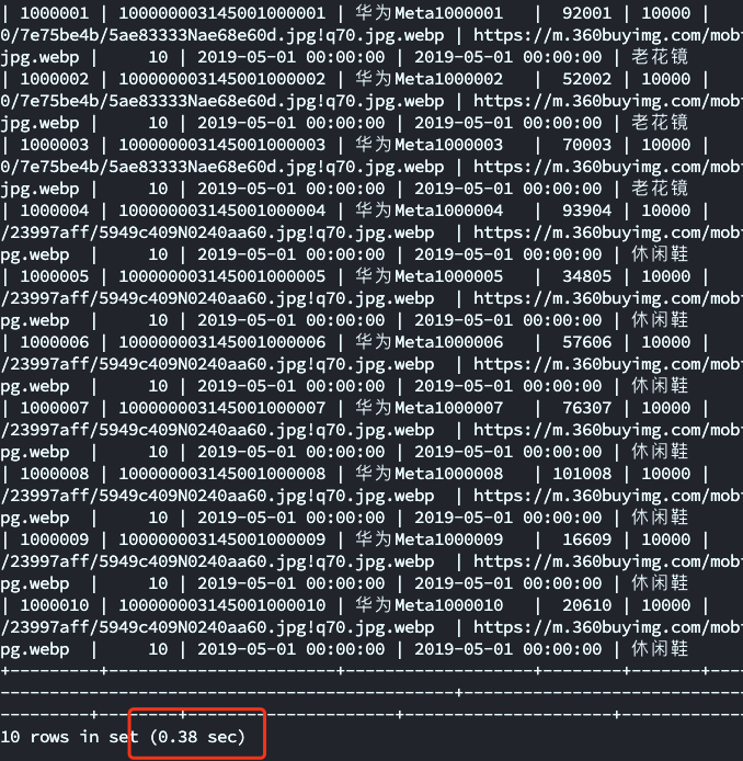 这里通过查询id 和子查询 的方式将查询结果缩短为 0.38s,比之前直接通过 select * 的方式要缩短一倍的查询时间。