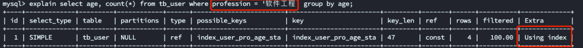 我们再来试试再加入过滤条件的情况,加入profession = 软件工程,此时group by 里面只显示 age,那么此时是否会走索引, 答案是 using index。因为满足了最左前缀法则。