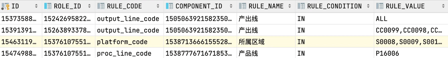 数据权限的核心表,规则条件的取值为IN,规则值存储具体的维度编码,当在数据维度中选择 全部 时我们将规则值存储为ALL这个特殊值,方便后续生成SQL语句。