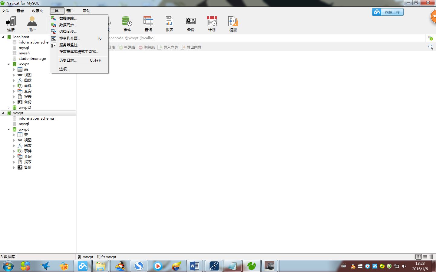2>选择navicat中连接服务器的数据库,在菜单栏选择工具–>数据传输