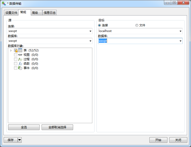 3>在弹出的的窗口中“源”部分就是你要导出的源数据库,“目标”就是本地的数据库,点击左下角全选后,再点击开始按钮
