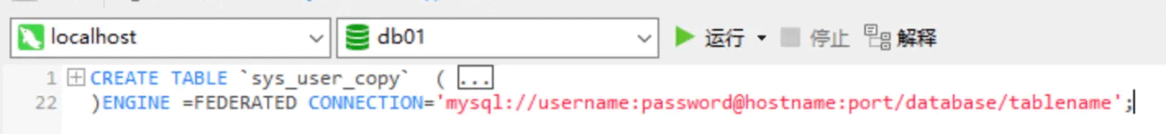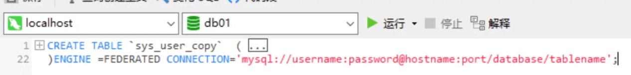 ENGINE =FEDERATED CONNECTION=’mysql://username:password@hostname:port/database/tablename’