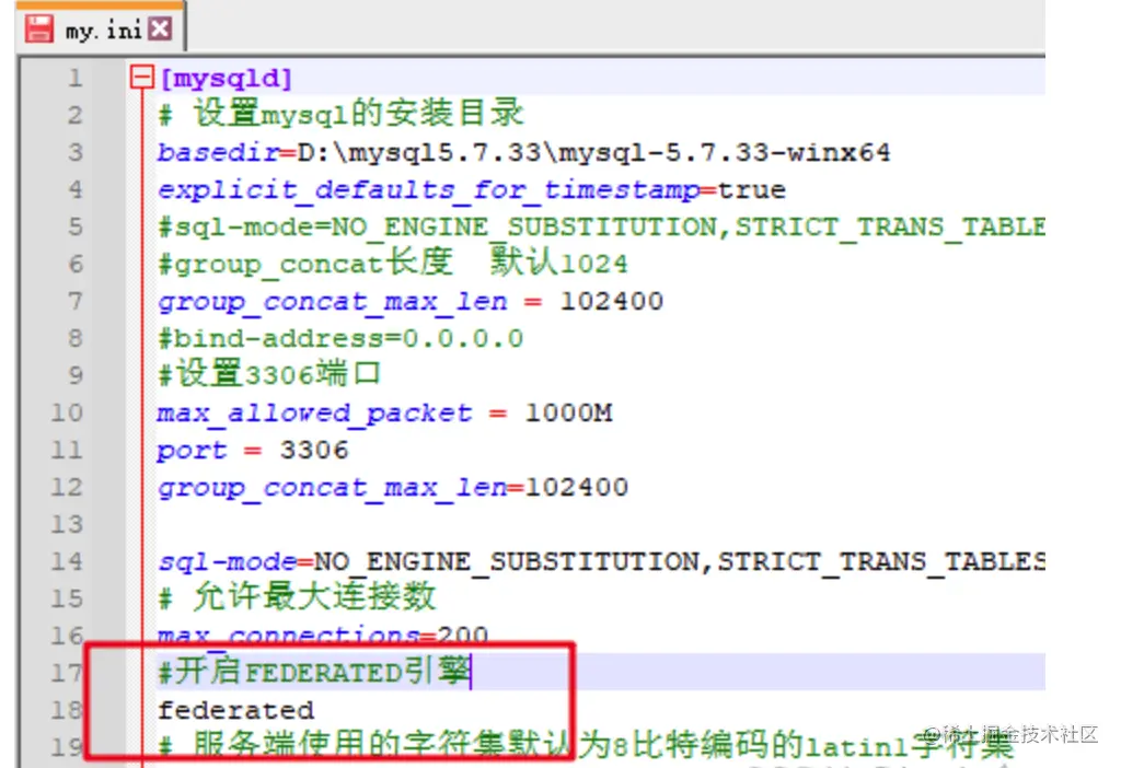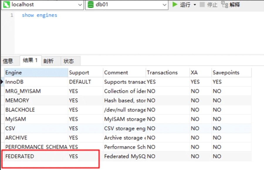如果这里是NO,需要在配置文件[mysqld]中加入一行:federated