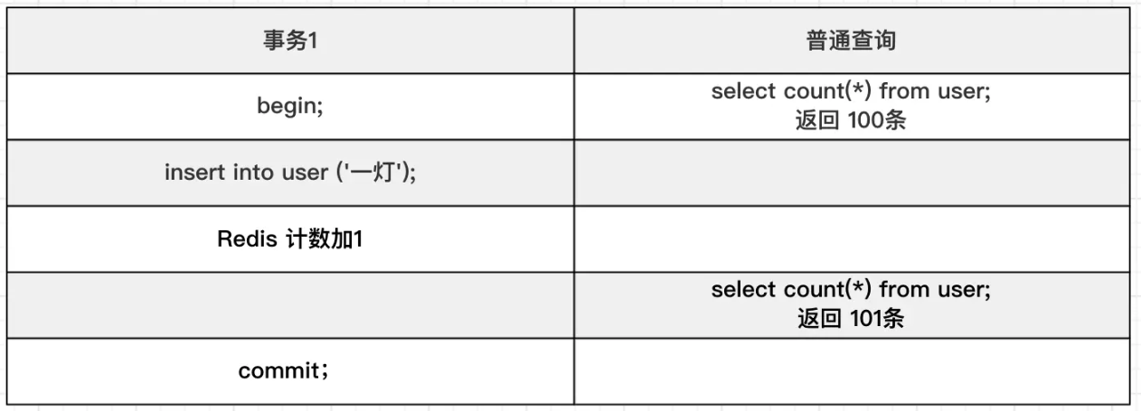 由上图中得知,虽然Redis计数加1操作放在了事务里面,但是不受事务控制的,在事务没有提交前,其他查询依然读到了最新的总行数,这就是脏读的情况。