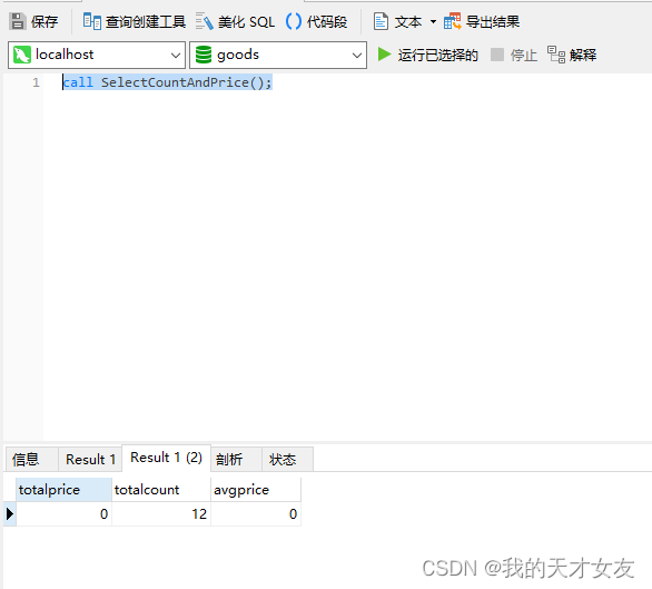 调用储存函数只需要使用SELECT,指定名称和参数,储存函数必须有返回值,参数只能是IN