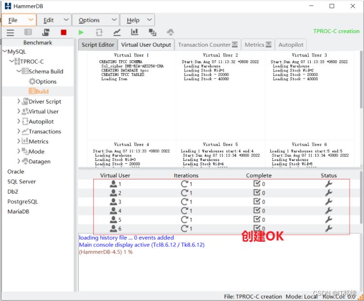 它主要模拟两种不同的测试模型:TPC-C 测试模型和 TPC-H 测试模型。相比于标准的 TPC-C 和 TPC-H,HammerDB 运行成本低,操作简单, 是服务器数据库压力测试