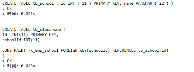可以看到,以上执行结果创建了两个关联表tb_school和表tb_classroom。其中,tb_classroom表为子表,具有名称为fk_emp_school的外键约束;tb_school为父表,其主键id被子表tb_classroom所关联。