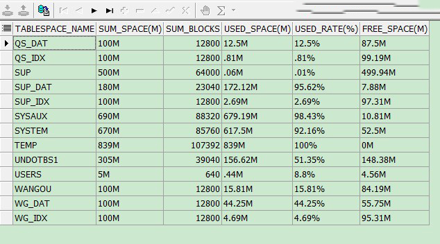 WHERE D.TABLESPACE_NAME = F.TABLESPACE_NAME(+)