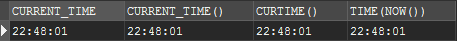 SELECT CURRENT_TIME,CURRENT_TIME(),CURTIME(),TIME(NOW());