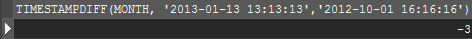 SELECT TIMESTAMPDIFF(MONTH, ‘2013-01-13 13:13:13′,’2012-10-01 16:16:16’);