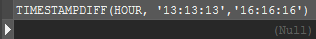 SELECT TIMESTAMPDIFF(HOUR, ’13:13:13′,’16:16:16′);