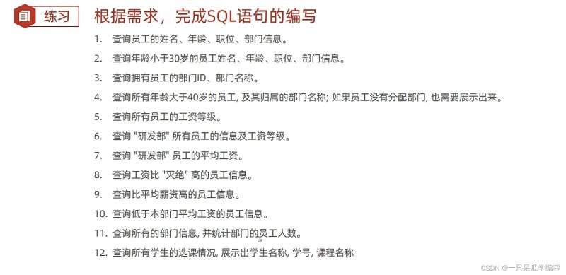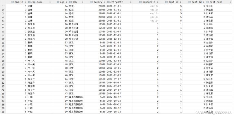1.查询员工的姓名,年龄,职位,部门信息(隐式内连接)