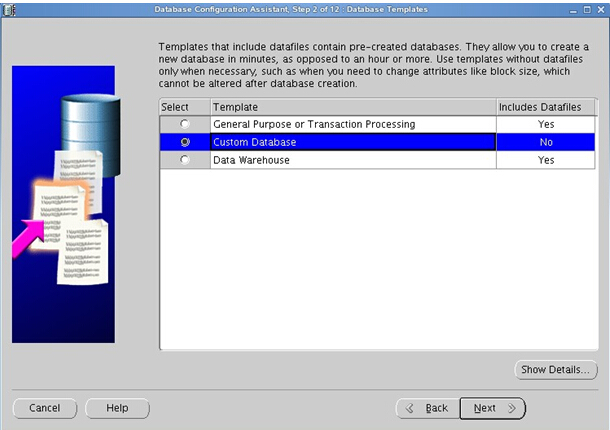 1) 还是在oracle用户的图形界面oracle用户中,新开启一个终端,直接输入命令dbca会弹出如下界面。我们这里采用定制数据库。