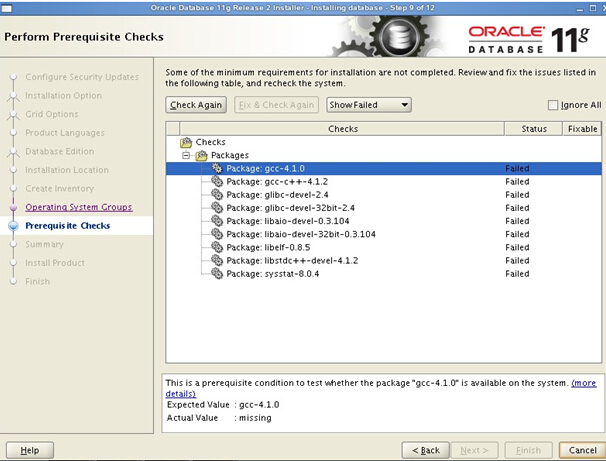 装到这一步,可以看到,可以查看到有很多的rpm包没有,我们可以从安装linux的光盘或ISO中(或去D:\linux_oracle11g_Package)查找所缺的包,使用ftp上传到linux中,然后使用rpm –ivh .rpm –nodeps –force 来进行安装(其中加上–nodeps — force 代表强制安装,是在直接使用rpm –ivh .rpm安装不成功的情况下用的)等到把包全部都安装好的情况下,再次在oracle图形界面中,执行安装过程2,下来在环境检查过程中,就通过了。