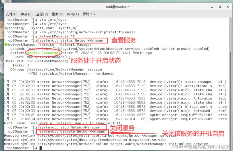 systemctl disable NetworkManager:关闭该服务的开机自启功能
