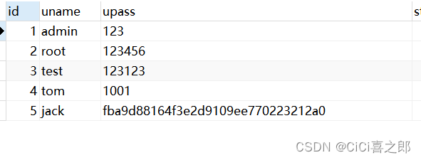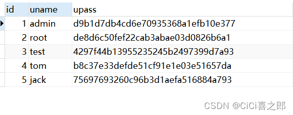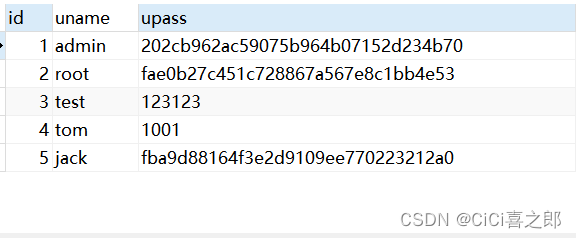 insert into user(uname,upass) values (‘jack’,MD5(‘1002’));