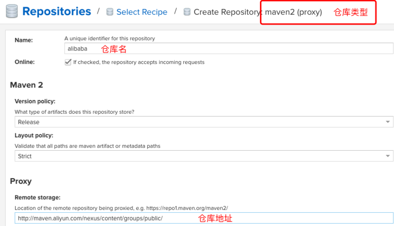 | proxy(代理类型) | 从远程中央仓库中寻找数据的仓库(可以点击对应的仓库的Configuration页签下Remote Storage Location属性的值即被代理的远程仓库的路径) |