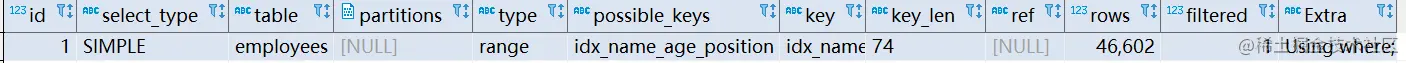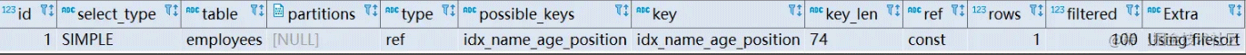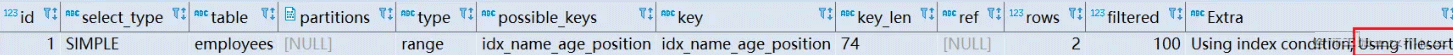 “expanded_query”: “/* select#1 */ select `employees`.`id` AS `id`,`employees`.`name` AS `name`,`employees`.`age` AS `age`,`employees`.`position` AS `position`,`employees`.`hire_time` AS `hire_time` from `employees` where (`employees`.`name` > ‘a’) order by `employees`.`position` limit 0,200”