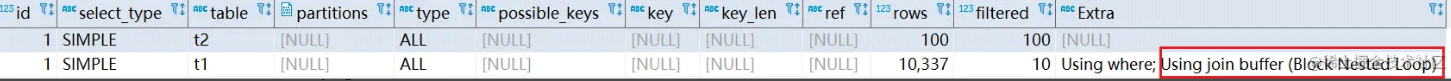 整个过程对表 t1 和 t2 都做了一次全表扫描,因此扫描的总行数为10000(表 t1 的数据总量) + 100(表 t2 的数据总量) = 10100。并且 join_buffer 里的数据是无序的,因此对表 t1 中的每一行,都要做 100 次判断,所以内存中的判断次数是 100 * 10000= 100 万次(非扫描次数) 。 注意: join_buffer 的大小是由参数 join_buffer_size 控制,默认256k。如果 t2 放不下就会使用分段策略(先从 t2 表取出部分数据,比对完就清空 join_buffer,再重新拿出来余下的部分进行比对)。