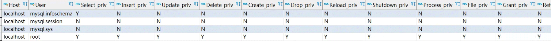 #查看MySQL权限 Host列表示那个Ip可以连接,User表示用户,后面的字段是权限