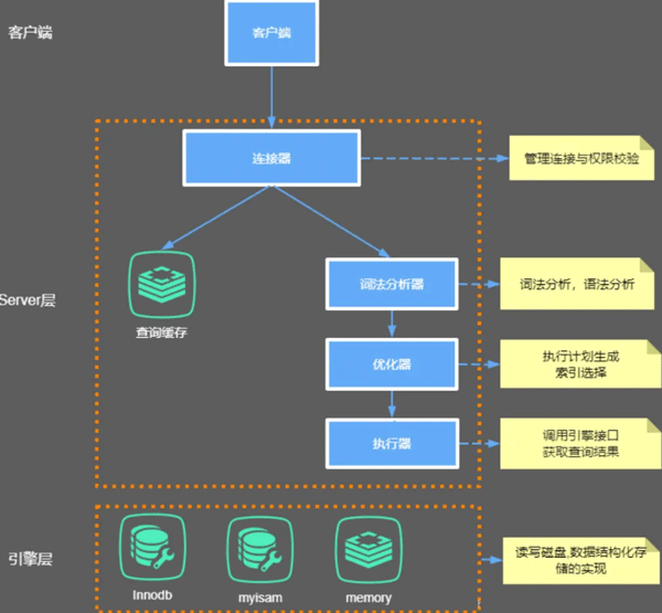- 6.执行计划交由执行引擎调用存储引擎接口,完成执行过程。这里要注意,MySQL的Server层和Engine层是分离的。