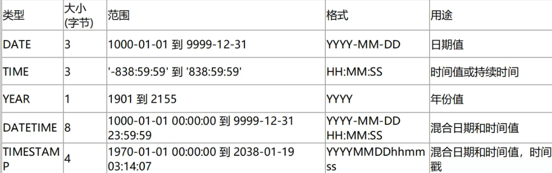 | VARCHAR | 0-65535 字节 | 变长字符串,varchar(n)中的n代表最大列长度,插入的字符串实际长度不足n时不会补充空格 |