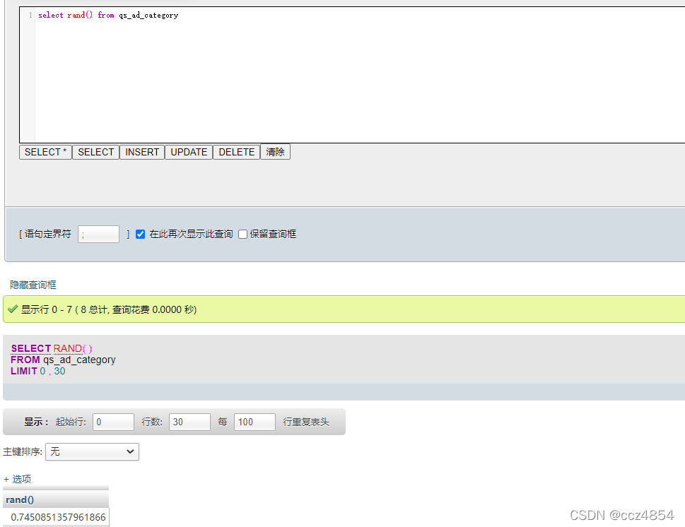 举例说明:select rand() from qs_ad_category;