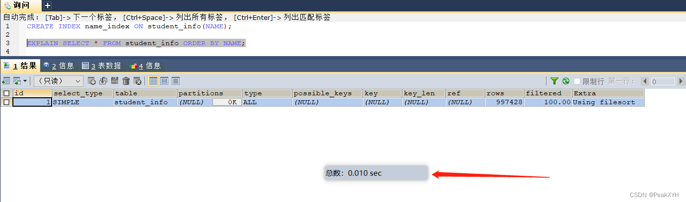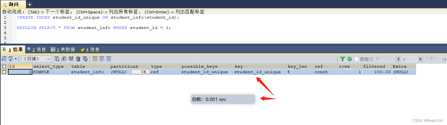 添加索引后,耗费0.001秒,使用了索引(但是创建索引的时候会耗费一定时间)