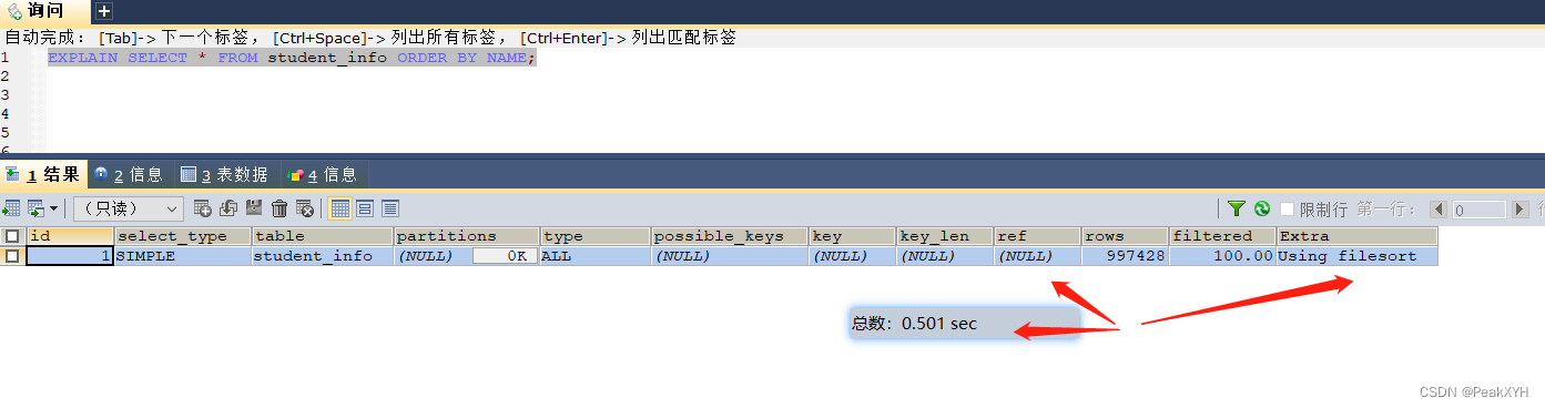 建立索引前,耗时0.501秒,使用的是所有数据在内存中排序