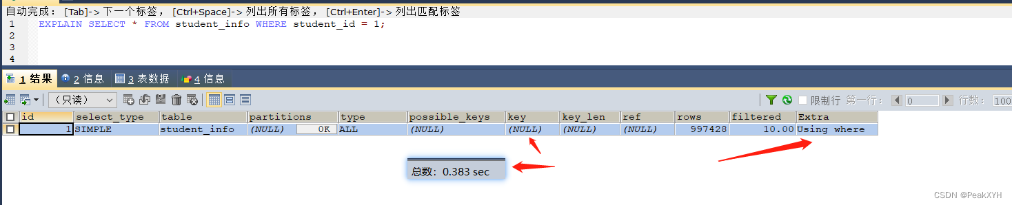 未添加索引前,耗费0.383秒,基本遍历整个表