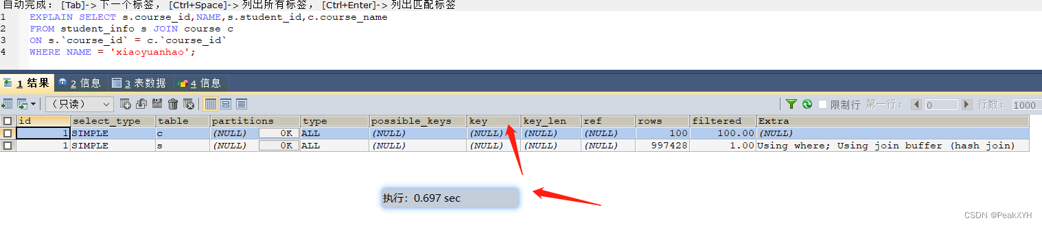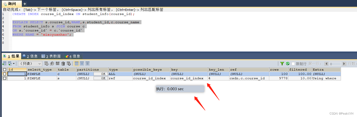 通过对小表进行逐一遍历,同时在大表中的连接字段建立索引即可加快查询,本案例中,每次取出课程表中course_id和学生表中学生的course_id进行连接操作,在学生表中对course_id建立索引即可
